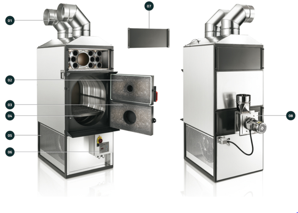 Capacitate calorică: 80 000 Kcal/ora (93 kW); Volum aer încălzit: 6300 m³/oră; suprafața de încălzit: 1500 m³; Consum combustibil: 30 kg/oră; Putere motor pentru aer cald: 1.1 kW; Putere motor evacuare gaze arse: 0.25 kW; Diametru distribuitor aer cald: 2*250 mm; Diametru hotă gaze arse: 180 mm; Dimensiuni de gabarit: 700/1280/1760 mm; Greutate: 415 kg; Lungime maximă lemn dimensionat pentru ardere: 750 mm.